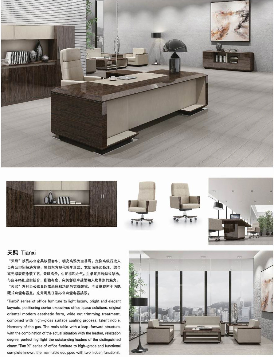 “天熙”系列辦公家具以輕奢侈、明亮高雅為主基調,定位高級行政人員辦公空間解決方案,獨創(chuàng)東方現(xiàn)代美學形式,寬切面修邊處理,結合高光感表面涂裝工藝,天賦高貴,中正祥和之氣。主桌采用跨越式結構,與皮革搭配虛實結合,張弛有度,完美彰顯卓越領袖人物尊崇的美麗。 “天熙”系列辦公家具以高品位和功能的完備著稱,主桌搭載兩個內隱藏式功能電器盒,充分滿足日常辦公功能電器接駁。